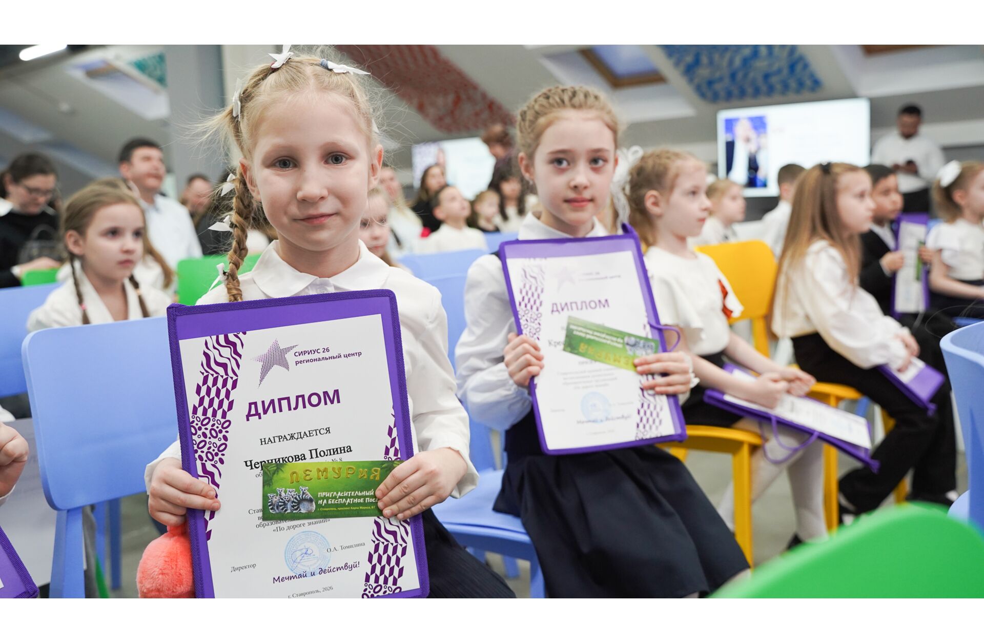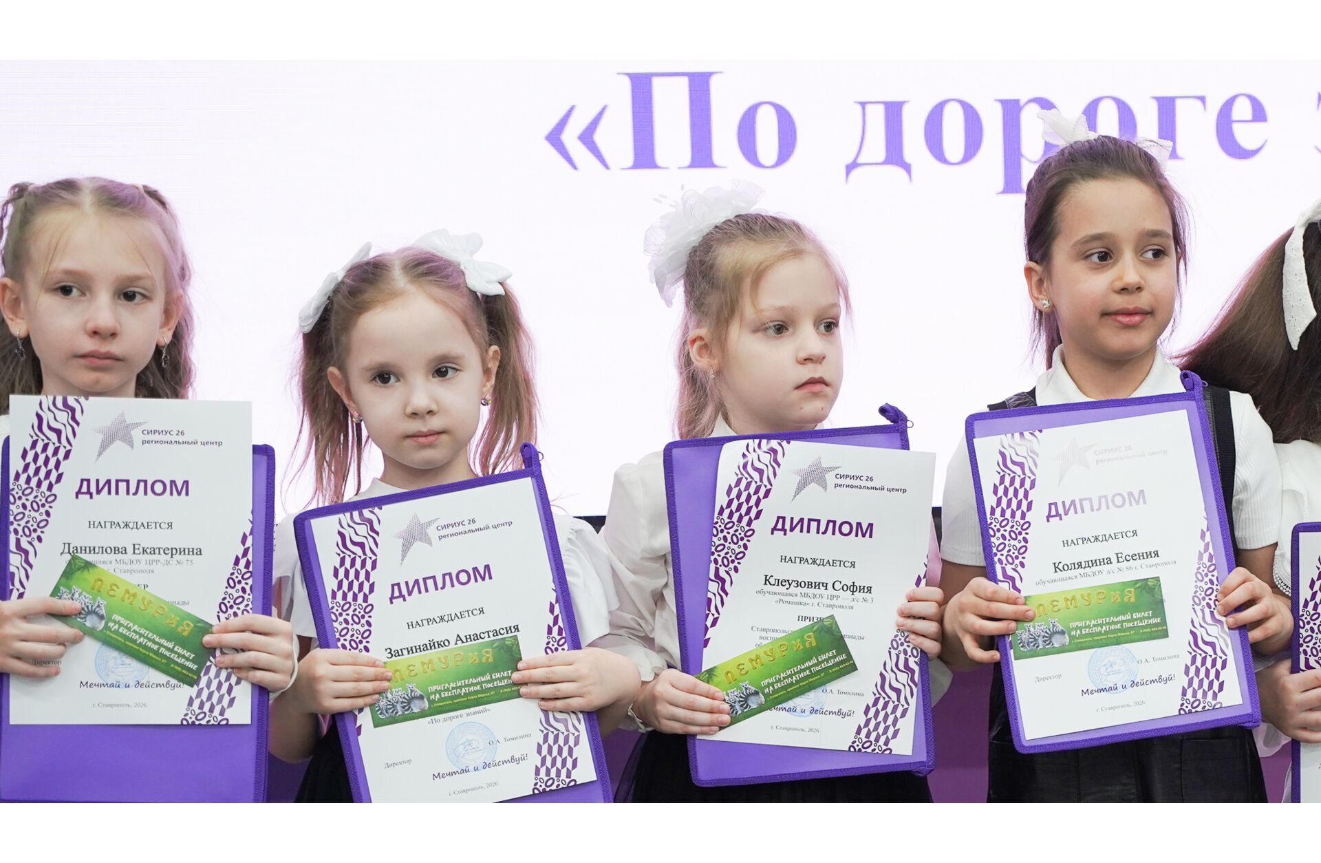 Каждый из присутствовавших в зале талантливых ребят получил именной диплом, фирменную папку-сумку от регионального центра «Сириус 26», в которую можно собирать свое портфолио. Все призеры получили билеты в зоопарк «Лемурия».